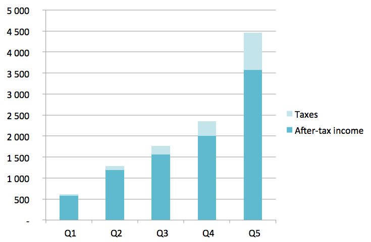 Key: Q1 corresponds to the first quintile of the income distribution, that is, to the lowest 20% of incomes. For the last quintile (Q5), average monthly pre-tax income is 4,500 euros, of which around 900 euros are paid in taxes, resulting in an income of 3,600 euros after taxes.
