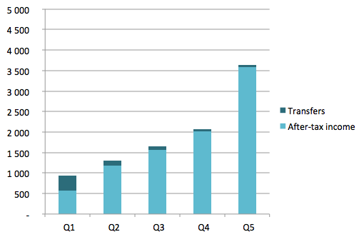 The system appears to be redistributive, in which the highest incomes largely contribute to financing national solidarity and the middle class does not appear to be particularly threatened by those with lower incomes, if one compares net income after tax and transfers between quintiles 2 and 3 (or 3 and 4). The group that might feel the most “threatened” by redistribution is quintile 2 (the employed working class), which receives no net gain from redistribution, but whose net income is ultimately quite close to those in the lowest income bracket.