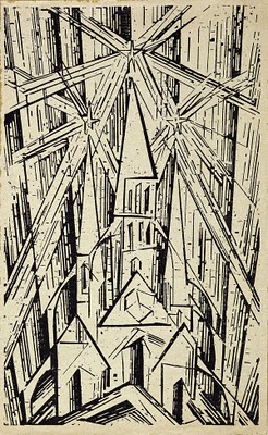 Lyonel Feininger (German, b. America, 1871-1956), Programm des Staatlichen Bauhauses in Weimar, April 1919. Woodcut with letterpress on green paper. 30.2 x 18.6 cm. Bauhaus-Archiv Berlin.