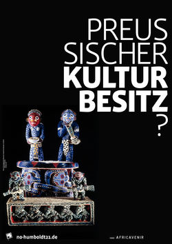 Still in Berlin, very recently, the Humboldt Forum project, which should bring together the ethnographic collections of various Berlin museums as of 2019, was recently the target of a major opposition campaign. The Humboldt Forum is being built on the former site of the Prussian royal palace, which was blown up by the GDR in order to be transformed into a “Palace of the Republic”, which was then in turn knocked down by reunified Germany to make place for a reconstruction of the baroque palace. It’s a complicated place. As is the project of using it to bring together the African, Australasian and Asian collections of the Berlin museums. A few months ago, a collective called NoHumboldt21 launched a campaign of posters that clearly showed how museums are no longer as “natural” as they may have been in the past. These posters, which were widely distributed, subverted the official graphic design and logo of the national museums of Berlin, grouped together within the Stiftung Preußischer Kulturbesitz (Prussian Cultural Property Foundation). One shows, against an elegant black background, the throne of a Bamum sultan from Fumban in Cameroon taken from the Berlin collections, and above which is printed, in big white letters, the following question: “Preußischer Kulturbesitz?” – “Prussian cultural property?” On another, we see a close up of a bronze portrait from Benin, with this other question: “Have you already gazed on war booty?”
