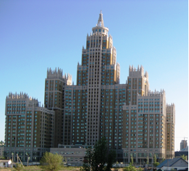 Cet immeuble résidentiel a été offert par Iouri Loujokov, alors maire de Moscou, à la ville d’Astana pour sceller le jumelage entre les deux capitales, prolongeant ainsi le lien unissant la métropole avec son ancienne colonie. Ce gigantisme typiquement stalinien n’est pas anodin, puisqu’il est la marque même de la domination soviétique sur son aire d’influence, comme en témoigne le palais de la culture de Varsovie. En effet, les Polonais n’ont jamais apprécié le gratte-ciel stalinien, copie des tours sœurs moscovites, qui leur a été imposé en 1955.