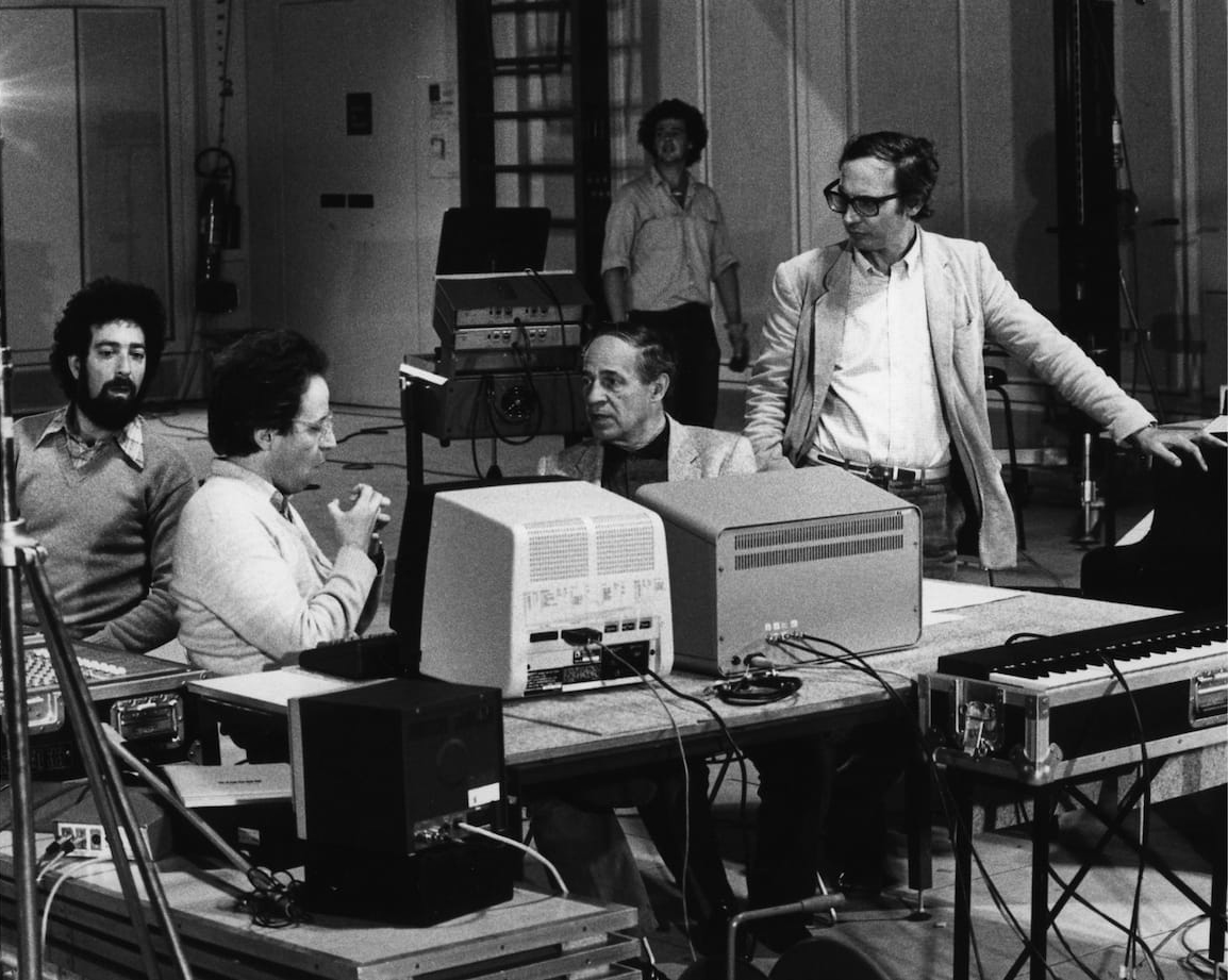 avec, de gauche à droite, Didier Arditti, Andrew Gerzso et Giuseppe di Giugno travaillant avec le dispositif électroacoustique pour Répons à l’Espace de projection (1980)