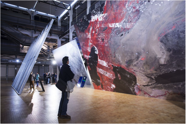 Tracer un tel triangle et nous enraciner dans la « terre » ne se fera qu’à certaines conditions : que nous nous libérions du rapport sujet-objet (procédure B : Without the World or Within) ; que nous mesurions les conflits impitoyables dont sont l’enjeu la croûte terrestre, les océans et l’atmosphère (procédure D : From Lands to Disputed Territories) ; que nous ne nous laissions pas emporter par le plaisir ou par l’effroi devant la catastrophe que nous avons causée (procédure C : Sharing Responsability : Farewell to the Sublime). Ce passage du sublime à la responsabilité correspond à la grande diagonale de l’accrochage. Il n’est plus possible aux humains de savourer le spectacle des forces naturelles dès lors qu’ils en font eux-mêmes partie et que leurs propres dommages ne leur laissent aucune marge où se replier. La sensation d’être désormais inséparables de la matière terrestre est renforcée par les couleurs de sous-sol, de minerais, d’eaux stagnantes qui imprègnent les photographies de Sophie Ristelhueber (WB #6, 2005/16), les impressions de Simon Starling (One Ton II, 2005), les photogravures de Tacita Dean (Quatemary, 2014) ou le bassin de Pierre Huyghe (Nymphéas Transplant (14-18), 2014).