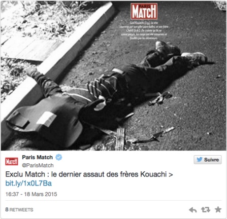 D’autres images sont réputées posséder une « valeur historique », et sont montrées à ce titre, même si elles portent une violence. On pense ici à l’image déjà mentionnée du corps du préfet Erignac, ou la photo publiée en ligne par Paris-Match également du corps d’un des frères Kouachi. Enfin, des images très dures peuvent être diffusées pour montrer une « souffrance à distance », dans le cadre « d’une topique du sentiment », qui permet de s’identifier aux tourments de l’autre, mais sans idée de dénonciation, et donc de mobiliser et d’éveiller les consciences : images de désolation (tremblement de terre à Haïti, tsunami en Thaïlande, etc.), d’enterrements de victimes de guerre, ou des images symboles de la souffrance. L’idée que l’image « dit » quelque chose intrinsèquement n’a donc pas disparu.