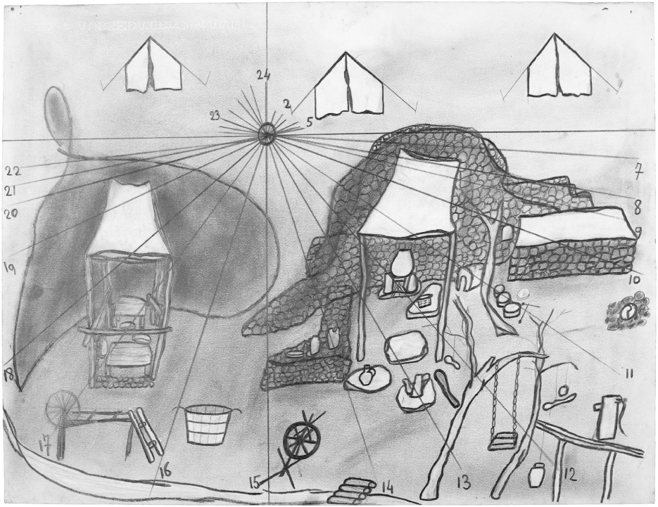 L’Île d’en bas, juillet ou août 1969. Carte tracée par Gisèle Durand-Ruiz. 50 x 65 cm