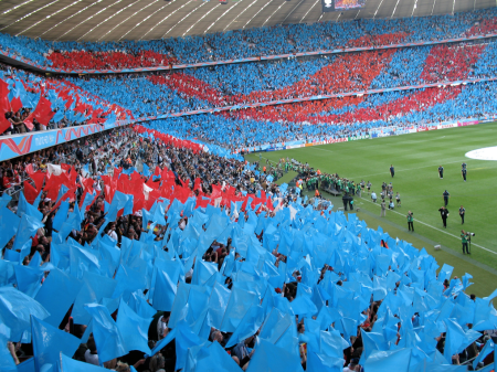 « L’épopée » des « Verts », qui culmine en 1976 avec la finale de coupe d’Europe jouée à Glasgow contre le Bayern de Munich, témoigne aussi d’un autre changement, côté spectateur cette fois. La télévision joue à cet égard un rôle paradoxal, en distendant les liens entre le public et le club local et en vidant d’abord en partie les stades, en participant ensuite à la coloration, au sens propre, de ces derniers et à leur animation. Les tribunes deviennent, autant que le match, le lieu du spectacle. Plus la télévision montre les signes du soutien à l’équipe, plus les spectateurs, qui sont aussi des téléspectateurs, savent qu’ils sont montrés et plus ils rivalisent d’imagination et de démonstration pour paraître, dans le stade et à la télévision. Dans le même temps, la norme du spectateur s’efface elle aussi, laissant place à celle du supporter, d’abord valorisé et identifié à travers l’attachement passionné et exubérant qu’il manifeste pour son équipe. Cette définition du rôle du supporter [8] puise, sur le plan européen, à une double source : côté britannique, celle d’un hooliganisme qui est loin de se réduire aux explosions de violence dans les stades ; côté italien, celle du mouvement « ultra », caractérisé en particulier par les démonstrations de plus en plus spectaculaires qu’il organise dans les tribunes. La diffusion de ces deux styles de supportérisme s’appuie sur l’accroissement des déplacements. L’accélération des communications, la multiplication des compétitions européennes (coupe d’Europe des Clubs Champions à partir de 1955, Championnat d’Europe des Nations à partir de 1968, coupe de l’UEFA à partir de 1971) permettent la comparaison, les rivalités et les effets d’imitation entre groupe de supporters. Tout cela participe à la nouvelle image des stades et contribue à créer un nouveau rapport au spectacle.