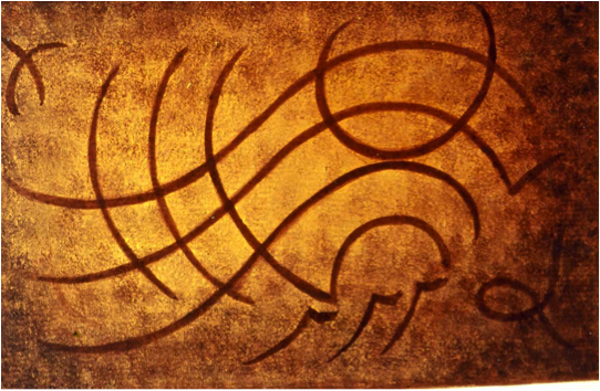 « Le petit miroir », relief-peint réalisé par Denis Martinez en 1967, et présenté au public lors de la première exposition du groupe Aouchem. Y figurent trois inscriptions en arabe : ceux qui furent, ceux qui sont, ceux qui seront. Courtesy of Denis Martinez.