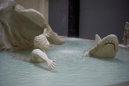 With Fons Americanus, the eeriness and sharpness of Walker’s drawings meet the large-scale three-dimensional. Both the figures’ shapes and texture have the urgent yet precise quality of Walker’s mark making. The figures in the fountain are “intentionally rendered in rough form…”. [25] As a matter of fact, they were done after preparatory clay models Walker made in her studio. Walker then worked with a U.K.-based fabrication company in order to “preserve the handmade feel of the pieces”, [26] and the pieces were eventually coated in “sustainable non-toxic materials” including a “solvent-free acrylic and cement composite”, [27] making them look “as if wet clay emerged from the concrete floor”. [28] Contrary to the fake sea treasures rendered in equally highly sophisticated technologies committed by the likes of a certain British art megastar (whose shark in formaldehyde Walker had in mind as she designed Fons Americanus), [29] Walker’s sculptures are firmly anchored in the “realm of fantasy”; [30] they assert themselves as unfinished, precarious; caught in the process of working things out through form; as testimony to the process of mark-making. Such is Walker’s way of addressing not so much the imagery of national and/or colonial memorials as their very efficacy as would-be iconic markers that “get the story wrong”. [31] Thus, it is first and foremost as form that Fons Americanus unsettles and undermines the monumental.