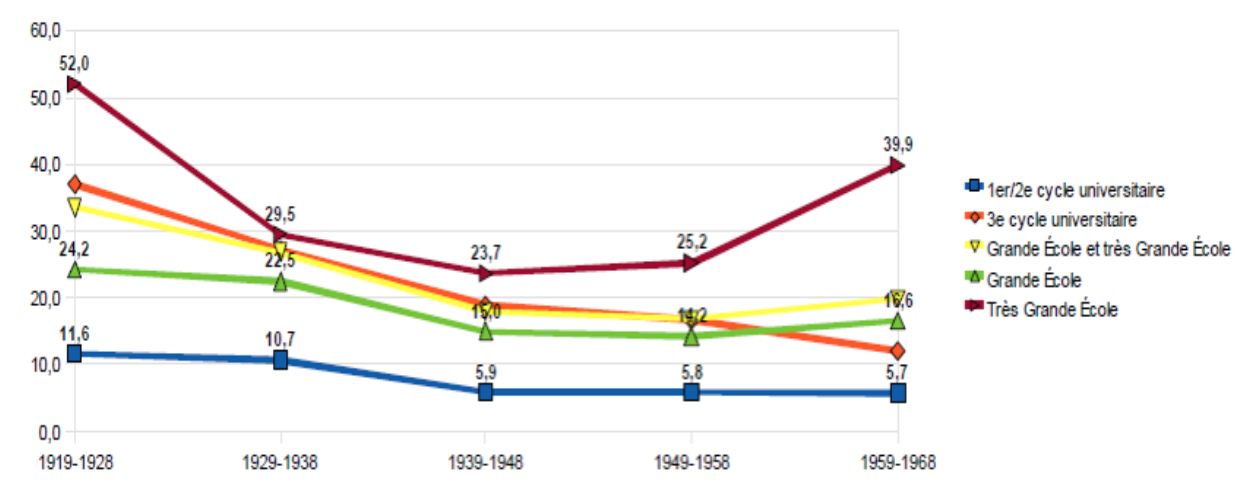 Ce résultat est contraire au principe même de la démocratisation de l’enseignement puisque les « écoles de pouvoir », les plus prestigieuses, sont de moins en moins accessibles aux enfants des classes populaires. Pour les générations nées entre 1959 et 1968, les chances relatives des enfants des catégories aisées d’être scolarisés dans une très grande école sont 39,9 fois supérieures à celles des enfants des catégories populaires. Cette inégalité des chances n’était que de 23,7 pour les générations nées en 1939-1948. En un demi-siècle, la fermeture sociale du recrutement social des très grandes écoles est considérable (graphique 1).