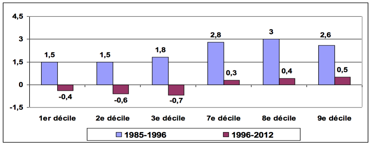 Lecture : de 1985 à 1996, la durée des études a augmenté de 1,5 année pour les élèves du premier décile, les moins scolarisés. Cette durée d’études a baissé de 0,4 année de 1996 à 2012.
