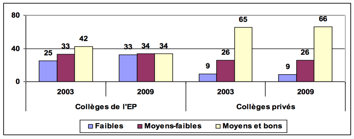 Lecture : Dans les collèges de l’éducation prioritaire, 25% des élèves sont d’un niveau faible en 2003 ; 33 % en 2009.