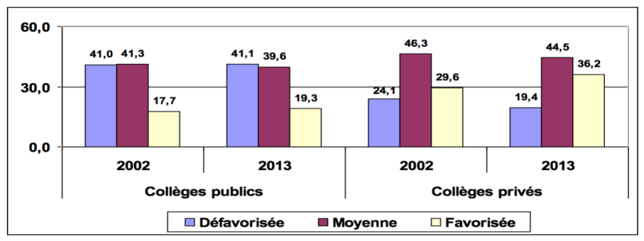 La ségrégation sociale et scolaire croissante des collèges résulte globalement d’une prolétarisation des collèges publics et d’un embourgeoisement des établissements privés. Le recrutement de plus en plus aisé de ces derniers tient, outre la politique d’assouplissement de la carte scolaire mise en œuvre à partir de la rentrée scolaire 2007 (Merle, 2012), au fait que ces établissements sont payants, non soumis à la carte scolaire et, contrairement aux établissements publics, sélectionnent leurs élèves selon des critères sociaux, notamment ethniques, pour près de 20 % d’entre eux (Du Parquet et alii, 2013).