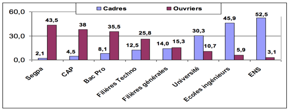 Graphique 2 : Proportion d’enfants de cadres et d’ouvriers selon le niveau d’études