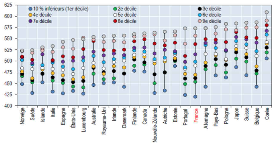Lecture : En France, les élèves du 1er décile selon le statut social (les 10% les plus défavorisés) ont un score en mathématiques inférieur à 425 points.