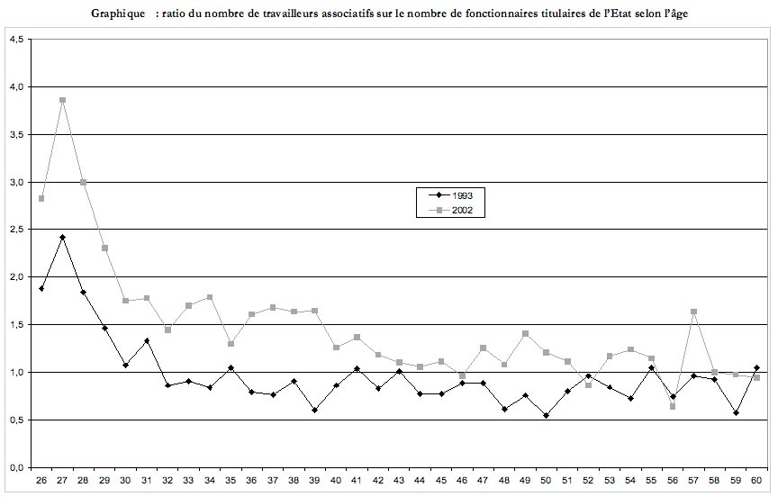 Ratio du nombre de travailleurs associatifs sur le nombre de fonctionnaires titulaires de l’Etat selon l’âge