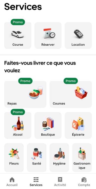 Interface de l’onglet « services » sur l’application Uber : variété de prestations proposées et mise en avant des promotions du jour