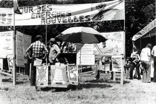 Ainsi, lors du rassemblement au Larzac de 1977, cinq forums simultanés traitent des luttes paysannes, de la militarisation de la société ou encore des alternatives au nucléaire. En parallèle, de nombreux stands se prêtent à la déambulation : les organisations politiques et syndicales y présentent leurs positions, la vente militante (autocollant, livres et brochures) finance des groupes alternatifs, les paysans vendent des produits régionaux. Le four solaire, l’autocollant antinucléaire, l’artisanat local sont les incontournables de ces rassemblements qui apparaissent comme un carrefour de la société alternative.