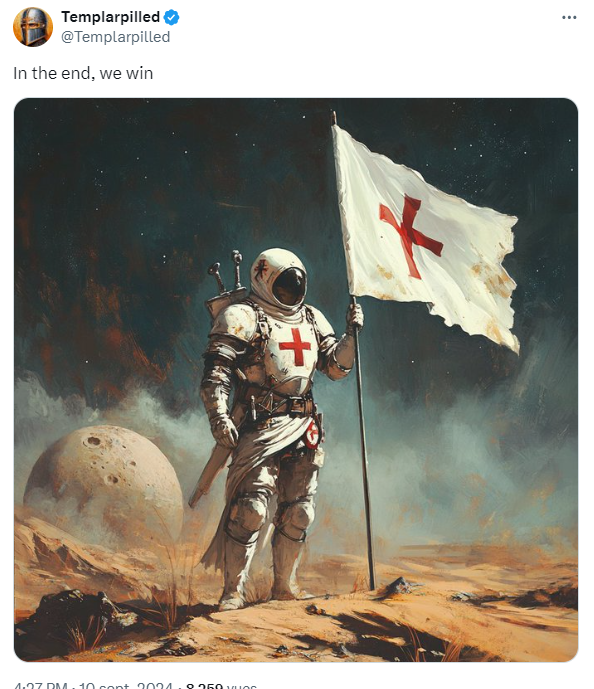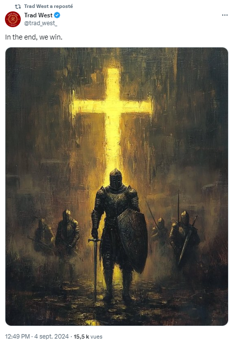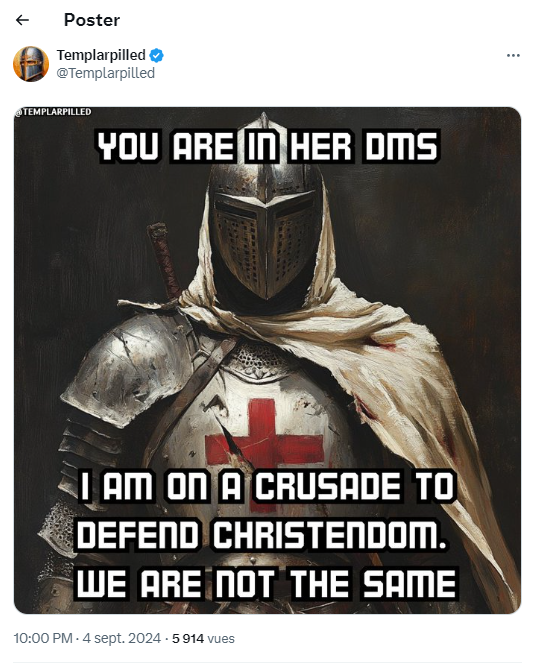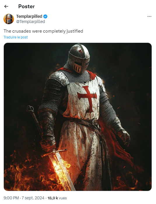 Ces utilisations ne sont du reste pas réservées au monde anglophone : en mai 2015, un compte Facebook nommé Liga de defensa española poste ainsi une image de croisé en prière avec comme texte « yo no soy racista, soy anti-islam » (je ne suis pas raciste, je suis anti-islam). Sur les réseaux sociaux francophones, ce sont des centaines de comptes proches de ce qu’on appelle souvent la « fachosphère » qui utilisent ainsi des images de croisés et/ou de templiers pour leur photo de profil. Ces comptes repostent significativement souvent des mèmes anglophones, notamment quand ils mettent en scène cette phrase « in the end we win », très souvent utilisée en conjonction avec une image médiévaliste tirant vers la croisade. Citons par exemple le compte @Templarpilled, qui, à l’image de @trad_west, utilise sans cesse cette phrase, alternant des images d’IA de croisés – parfois dans l’espace –, des messages invitant à se convertir au christianisme et des propos misogynes, homophobes ou invitant en général à la violence (ainsi de ce fréquent « tolerance is not a christian virtue », souvent illustré par un saint George tuant le dragon ou, à nouveau, par des images de croisés).