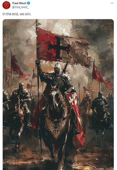 Pour y répondre, plongeons-nous d’abord dans les publications d’un compte X (anciennement Twitter) intitulé @trad_west, compte anglophone suivi par près de 200 000 personnes. Plusieurs fois par heure, ce compte poste une image, généralement accompagnée d’un message religieux on ne peut plus simple : « Christ is king » ou encore « in the end we win ». Ce dernier propos s’accompagne presque systématiquement d’une image faisant référence à la croisade : il peut s’agir soit d’illustrations produites au XIXe siècle, comme des gravures ou des tableaux, soit de captures d’écran du film Kingdom of Heaven, réalisé en 2005 par Ridley Scott, soit enfin d’images réalisées avec des IA génératives. Le plus souvent, on y voit un ou plusieurs chevaliers, vêtus d’armures lourdes, brandissant des épées, arme médiévaliste par excellence [2], ainsi qu’une ou plusieurs croix.