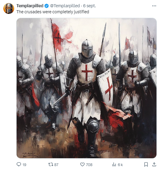 Pour résumer, on peut dire que ces influenceurs partagent trois choses. Ils partagent d’abord des stratégies, notamment celle du matraquage : publier, plusieurs fois par semaine, voire par jour ou par heure, les mêmes messages, les mêmes types d’images, quitte à le faire faire par un bot automatisé, afin d’inonder les fils Twitter ; on peut également relever l’usage généralisé des images produites par des IA pour obtenir des images de chevaliers héroïques brandissant, dans une fusion significative entre le Moyen Âge et la fantasy médiévaliste, des épées enflammées ou des croix lumineuses. Ils partagent ensuite des imaginaires historiques : on soulignera en particulier ici cette intéressante articulation entre croisade et masculinité réinventée, qui permet de tenir un discours à la fois décliniste – les hommes étaient « mieux » avant – et optimiste – il « suffit » de s’engager dans cette croisade virtuelle, si possible en cliquant sur tel lien et en achetant tel produit, pour aussitôt revenir à et redevenir ce modèle de masculinité. Enfin et surtout, ces acteurs partagent également des objectifs, qui s’articulent en trois temps : il s’agit d’abord de redorer le blason des croisades médiévales en les présentant comme des entreprises légitimes (« justifiées ») et même nécessaires afin de défendre un monde occidental menacé par un islam expansionniste. Cette manière de penser la croisade médiévale qui permet, dans un second temps, d’appeler de manière plus ou moins euphémisée à l’organisation de nouvelles croisades sur le sol européen ; ce qui autorise à et même exige, enfin, d’appeler à la violence ou de légitimer un passage à la violence dans le vrai monde, qu’il s’agisse d’aller taguer une mosquée, d’insulter un universitaire ou de prendre les armes pour commettre un attentat.