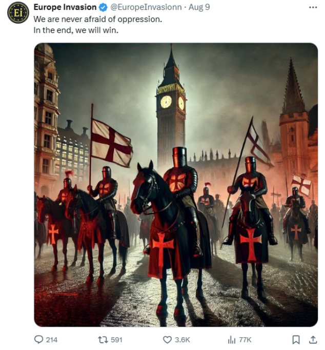 Comme chez @trad_west, la rhétorique s’articule autour d’un « nous » non défini, mais auquel le lecteur est censé adhérer immédiatement : même si la deuxième image est en elle-même assez angoissante, de par la présence de ces chevaliers armés, en rouge et noir, il est évident qu’ici les chevaliers n’incarnent pas l’oppression mais au contraire la libération, et sont du côté du lecteur, du côté de ce « nous » opposé à un « eux », en l’occurrence aux musulmans. Le recours à l’imagerie de la croisade inscrit les émeutes dans une perspective cyclique : tout comme les vagues migratoires contemporaines sont censées représenter une nouvelle « invasion arabe », il y aura une « nouvelle croisade » pour apporter finalement la victoire à une chrétienté occidentale pour l’instant sur la défensive. Comme l’analyse bien le politologue Stéphane François, ces usages contribuent à faire des militants qui les créent ou les font circuler « des nouveaux chevaliers, [qui] ne combattent plus le dragon, mais un danger bien plus grand selon eux : le chaos racial à venir [6] ».