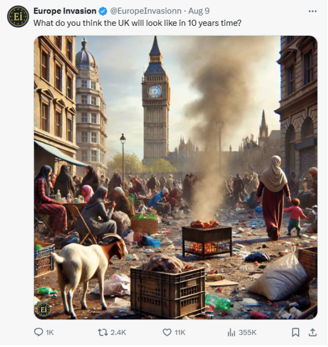 Cet attachement à la croisade n’est d’ailleurs pas exclusif d’un goût tout autant fantasmé pour d’autres périodes : dans la boutique de @trad_west, les pulls décorés d’une croix de Jérusalem, d’un « Templar division » ou encore d’un « son of God » côtoient ceux marqués par un lambda et un « son of Sparta [3], ou encore « SPQR ». Le fait de convoquer ensemble ces périodes éloignées par le temps – il y a presque deux fois plus de temps entre Sparte et les Templiers qu’entre ces derniers et nous ! – et très dissemblables peut sembler paradoxal, mais c’est qu’ici les trois éléments sont vus comme appartenant à une civilisation occidentale éternelle, dont l’essence transcenderait les siècles et qui doit être défendue. Car, dans tous les cas, on retrouve derrière ces usages de l’histoire l’idée d’une menace : le fait de rappeler que « in the end we win » revient à la fois à décrire l’existence d’un combat (actuel) et à prophétiser une victoire (finale) qui actuellement paraîtrait tout sauf garantie. Ces comptes convoquent ainsi, plus ou moins explicitement, l’idée d’une civilisation occidentale menacée sous l’effet d’un « Grand Remplacement » par des populations étrangères ou de l’hégémonie de valeurs « wokistes [4] ». Ce tableau réactualise en réalité le vieux schème réactionnaire du « déclin d’une civilisation [5] », permet de présenter la croisade comme une solution en même temps qu’une nécessité : seule une croisade permettra de sauver l’Europe/l’Occident/la chrétienté. Le 9 août 2024, alors que des groupuscules d’extrême droite mènent des attaques ciblées dans plusieurs villes anglaises, un autre compte Twitter significativement nommé European Invasion poste ainsi une image montrant Londres remplie de déchets, d’animaux et de personnes portant des voiles musulmans, censée représenter « le Royaume-Uni dans dix ans », puis une image montrant la même ville « nettoyée » par des chevaliers croisés montés sur des chevaux. Le texte qui accompagne la seconde image dit « we are never afraid of oppression. In the end, we will win ».