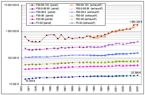 Note : En 2007, le salaire moyen du top 0.01% était de 1 682 324 euros. Sources : Panel DADS (1976-2007) et France – fichiers exhaustifs DADS (1994-2007).