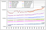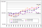 Afin d’analyser l’évolution des inégalités, nous calculons les fractiles en haut de la distribution des salaires [8]. Le graphique 1 montre l’évolution des salaires pour les différents fractiles. Nous constatons une augmentation globale des salaires, mais à des taux différents pour chaque fractile. F0-90 croît assez lentement. Dans l’ensemble, F90-95, F95-99 et F99-99.9 semblent augmenter régulièrement et au même taux. F99.9-99.99 et F99.99-100 croissent plus rapidement, en particulier au cours des dix dernières années. En 2007, le dix-millime supérieur, soit les 0.01% les mieux payés dans le secteur privé (1692 personnes), touchaient au minimum 867 000 €, et en moyenne 1 682 000 € par an, alors que les 90% les moins payés touchaient entre 7 600 € et 46 700 € de salaire brut annuel et gagnaient en moyenne 22 400 €.