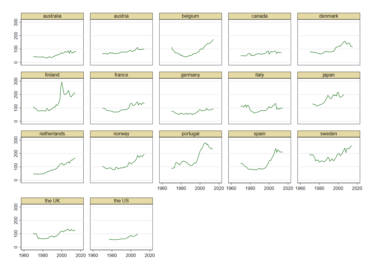 Plusieurs résultats remarquables apparaissent à la suite de ce calcul (graphique 1). Premièrement, le coût unitaire tend à décroître dans une majorité de pays, suggérant une baisse du coût d’accès aux services financiers. Deuxièmement, la baisse est particulièrement marquée à partir du début des années 1990, c’est-à-dire après les tourments macroéconomiques des années 1970-80. En effet, parce que les taux des dépôts sont par nature plus rigides que les taux d’emprunt, l’inflation et la hausse sous-jacente des taux nominaux ont permis aux banques d’accroître le prix implicite de leurs services financiers via l’augmentation de leurs marges d’intérêt. Troisièmement, à l’exception de la Nouvelle-Zélande, les pays où la finance de marché domine (Australie, Canada, États-Unis, Grande-Bretagne) présentent un coût unitaire relativement stable entre 1980 et 2014. Ceci contraste avec le reste de l’échantillon pour lequel le coût décroît significativement sur cette période. Quatrièmement, la prise en compte des revenus du capital ne change pas radicalement les résultats, même si la baisse du coût unitaire y apparaît moins forte. Conformément aux transformations des systèmes financiers et au développement de la titrisation depuis les années 1980, la part des revenus du capital des banques s’est beaucoup accrue sur l’ensemble de la période, néanmoins, ceci ne compense pas la baisse relative des autres revenus par unité de services produits. Cinquièmement, les coûts unitaires tendent à converger (graphique 2). Ceci signifie que l’intégration croissante des marchés financiers coïncide avec la réduction des coûts d’intermédiation.