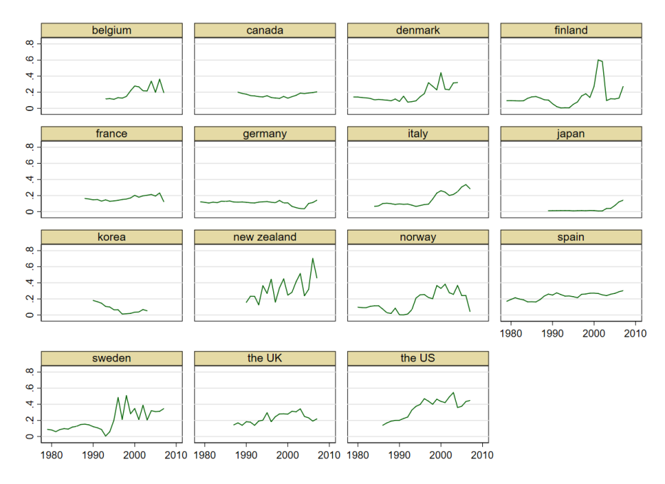 En revanche, les profits ne semblent pas se réduire---du moins dans le secteur bancaire, pour lequel les données sont disponibles. En particulier, les profits distribués rapportés au total des actifs et engagements intermédiés augmentent significativement entre 1980 et 2007 dans une majorité de pays (graphique 4). Ainsi, les gains de productivité se sont accompagnés d’une réduction du coût unitaire des facteurs de production et d’un accroissement du pouvoir de marché des intermédiaires financiers.