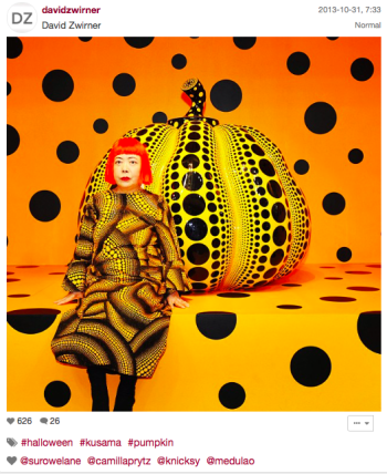 Yayoi Kusama avec l’une de ses fameuses citrouilles. Source : Instagram @davidzwirner
