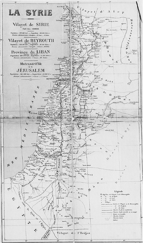 source : Vital Cuinet, La Syrie, Vilyat de Syrie, Vilayat de Beyrouth, Province du Liban, Mutessariflik de Jérusalem. Syrie, Liban et Palestine : géographie administrative, statistique, descriptive et raisonnée. Fascicule 4, 1901.