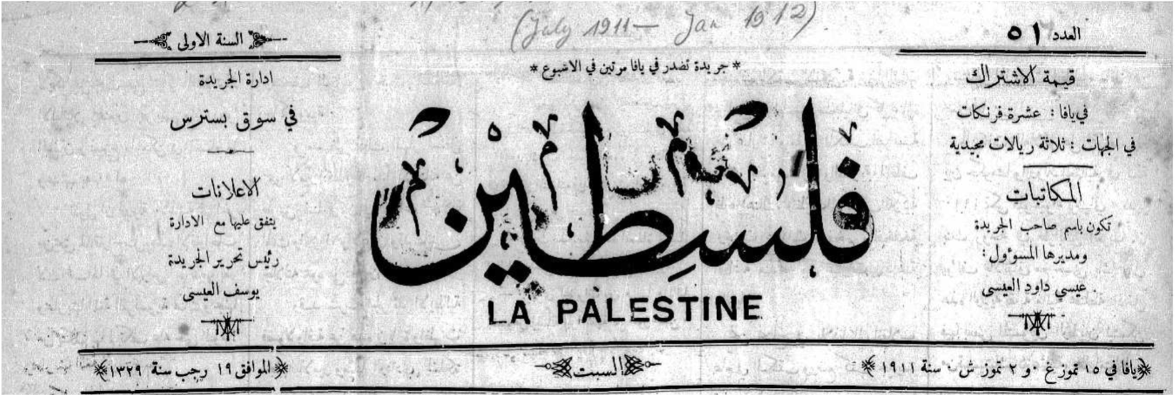 La propagation de la culture écrite participe aussi à cultiver un imaginaire commun et de nouvelles manières de s’identifier à l’Empire ottoman, partagées par le groupe des locuteurs de langue arabe et aussi, plus largement, des habitants de Palestine. Les journaux en arabe et en hébreu impriment la marque d’une forte identité locale. Le journaliste arabe chrétien Jurji Habib lance en 1900 et 1903 les journaux « al Quds » (Jérusalem) et « Ilm wa adab al Quds » (la science et la littérature de Jérusalem) (Büssow, 2011 : 462 : 465). Plus éloquent, le journal bihebdomadaire « Filitîn » (Palestine) paraît à Jaffa en langue arabe à partir de 1911, produit par Isa Daoud Isa, un diplômé de l’Université américaine de Beyrouth.