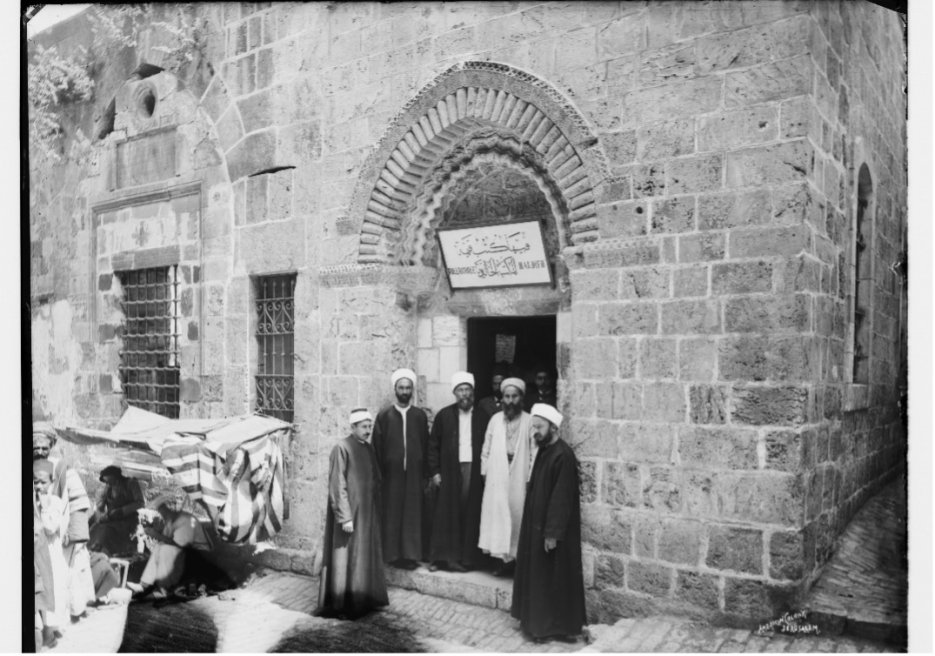 1900. Costumes and characters, etc. Mohammedan (i.e., Muslim) sheikhs and effendies in front of Bibboth Khaldieh (i.e., Khalidiyah Library), Jerusalem LOC matpc.06804.