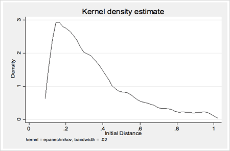 Si l’efficacité moyenne semble différente entre les entreprises protégées et non protégées, il ne faut pas oublier les différences à l’intérieur de ces groupes. Une des spécificités des mesures antidumping est qu’elles s’appliquent à l’ensemble des entreprises européennes produisant le bien qui a fait l’objet d’une enquête, même si certaines de ces entreprises n’ont jamais fait la demande d’une telle protection. Comme la figure 2 le montre bien, les entreprises recevant une protection n’ont pas toutes la même productivité initiale. La concentration à gauche de la courbe de distribution de la productivité indique que la plupart des entreprises protégées ont une faible productivité initiale. De plus, la queue étroite de cette courbe de distribution indique que les entreprises protégées sont peu nombreuses à avoir un niveau initial de productivité élevé. Ce dernier point soulève la question suivante : les entreprises réagissent-elles toutes de la même façon au protectionnisme commercial ?