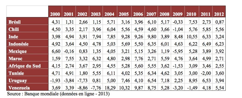 Tableau 1 : Comparaison des Taux de croissance du PIB (%) de pays émergents avec ceux des pays peu présents dans les listes