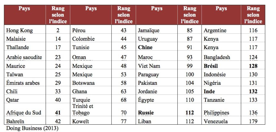 En se référant simplement à l’indice de « facilité des affaires » proposés par la Banque Mondiale (Doing Business, 2013) et en sélectionnant des pays à revenus intermédiaires, on note que les pays coutumiers des listes de pays émergents sont ceux qui, ayant une forte croissance, figurent parmi les 80 premières places du classement de l’indice (Tableau 2).