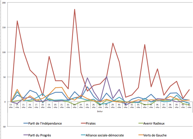 Nombre de nouveaux « like » par semaine pour la page Facebook des partis politiques islandais depuis le 23 mars 2015. Données gracieusement transmises par Þórgnýr Thoroddsen, membre pirate du conseil municipal de Reykjavík.