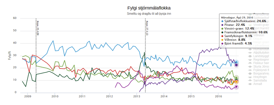 Les structures partisanes islandaises restent historiquement moins structurées et closes que dans les pays européens, la participation aux primaires peut compter jusqu’à un tiers d’électeurs qui ne voteront pas par la suite pour le même parti, et la multiplication des petits partis est un fait notable depuis une trentaine d’années. Les élections parlementaires de 2013 comptaient ainsi un nombre record de 15 partis se présentant au suffrage, dont 9 sont nés entre 2009 et 2013. La présentation de listes est chose particulièrement aisée dans le pays puisque qu’elle ne nécessite que la recommandation officielle d’une centaine d’électeurs inscrits. Leur maintien sur une longue durée reste par contre une exception. Jusque-là, la seule liste ayant perduré pendant au moins deux législatures à l’échelle nationale restait la Kvennalistin, la « Liste des femmes », apparue dans les années 1980 et qui avait charrié avec elle tout un ensemble de revendications féministes avant de fusionner avec l’Alliance sociale-démocrate. Il est intéressant de voir que la Liste des femmes et son maintien correspond à l’émergence d’idées qui ont durablement touché la société islandaise (fréquemment citée en exemple pour ses politiques d’égalité homme/femme) et qui font désormais autorité.