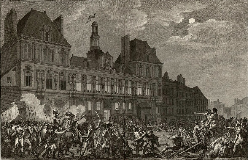 L’attaque de l’Hôtel-de-Ville par les troupes de la Convention, le 9 thermidor an II (26 juillet 1794). Dessin de Charles Monnet, gravé par Duplessis-Bertaux et Helman, 1799.