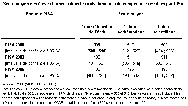 Le tableau suivant indique le score moyen obtenu par les élèves français dans chacun des trois domaines de compétence évalués par le programme PISA (compréhension de l’écrit, culture mathématique et culture scientifique) lors des trois vagues de l’enquête :