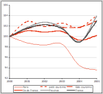 Le bilan des effets de ce qui, le temps passant, ressemble plus à un déclin qu’à une crise, reste largement à faire. Dans les éléments disponibles, on peut avancer que cet effondrement de l’emploi se traduit par un effet de rattrapage de l’Île-de-France sur la Province en termes de chômage et de pauvreté. Les incertitudes statistiques – sans parler des fantaisies conceptualo-administratives – sur le chômage rendent difficile l’usage de données. Le RMI, qui n’est pas exempt non plus de biais pour l’analyse territoriale, nous donne des chiffres suffisamment frappants pour faire sens : entre 2000 et 2004, leur nombre augmente de 11% en province et de 25% en Île-de-France (et également à Paris).