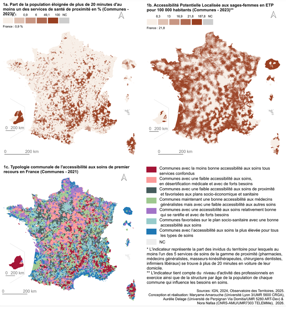 Ainsi, pour la santé, la proximité est couramment définie selon une distance-temps de vingt minutes de trajet (Figure 1a). Cela exclut des espaces ruraux et de faible densité, notamment dans les massifs montagneux, où ces services sont les plus éloignés. La diagonale du vide est également visible dans le secteur particulier des sages-femmes (Figure 1b), où les conditions d’accessibilité sont à croiser avec le confort (ou l’inconfort) de la parturiente. La cartographie d’un indicateur synthétique de l’accessibilité aux premiers soins (Figure 1c) dessine un territoire national composite, où les territoires avec les meilleures accessibilités se situent dans les bassins métropolitains et les littoraux.