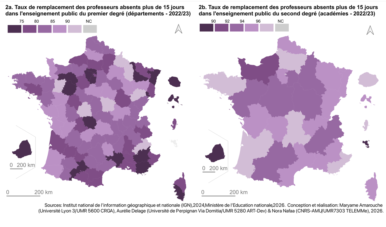 En matière éducative, la présence d’un établissement peut masquer une offre dégradée, comme le suggère par exemple l’analyse des taux de remplacements des enseignants absents plus de quinze jours (Figures 2a et 2b). Les écarts entre départements sont particulièrement flagrants en ce qui concerne l’enseignement public du premier degré (Figure 2a). Les territoires ultramarins et franciliens, à l’exception de Paris, figurent parmi les moins dotés tout comme le Gard, le Haut-Rhin, la Corse-du-Sud, le Var, les Alpes-de-Haute-Provence, l’Orne, la Sarthe, la Creuse et la Haute-Garonne, loin d’une égalité territoriale de service.