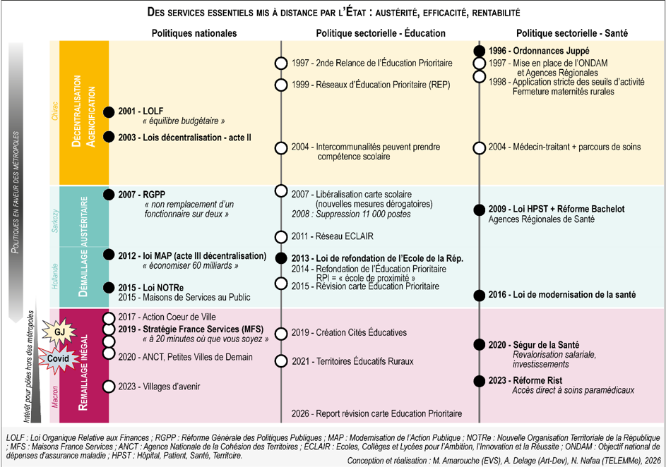 La mise à distance des services essentiels ne saurait donc être réduite à une somme de contraintes locales ou à un simple problème d’aménagement. En santé comme en éducation, elle est produite et organisée par des choix institutionnels. Les politiques de remaillage territorial et les dispositifs de compensation mis en œuvre depuis une quinzaine d’années ont certes recomposé l’accessibilité aux services essentiels. Mais la substitution d’une présence locale continue par des formes d’accès mutualisées, numérisées ou conditionnelles – qualifiée officiellement de « recomposition » de l’offre – cache mal le retrait insidieux de l’État de certains territoires. Elle déplace en réalité une partie du coût de la proximité vers les territoires et les individus.