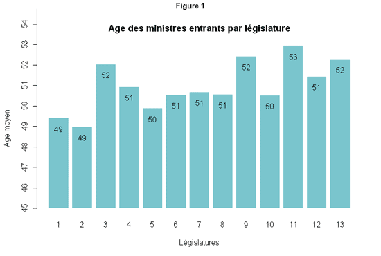 L’âge des ministres démontre une stabilité étonnante durant la Ve République. Il oscille très légèrement dans le temps sans connaître, a priori, de tendance à la hausse ou à la baisse (Figure 1). En fonction des législatures, il varie entre 49 et 53 ans.