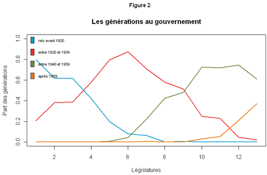 Il n’y a pas assez de données ici pour identifier des cycles ou des caractéristiques spécifiques fortes. Il est vrai que la génération d’entre-deux-guerres a eu une période de quasi-monopole sur les cabinets que les autres générations ici isolées n’ont jamais connu. La principale différence avec ce qui a eu lieu à l’Assemblée nationale (Grossman & François 2011) est que les changements sont plus radicaux ou plus abrupts en ce qui concerne l’exécutif.