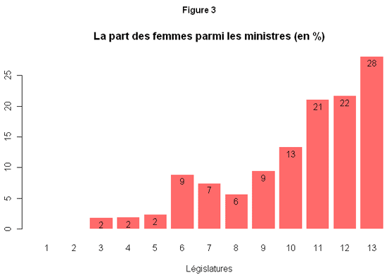 La question de la présence des femmes dans les organes politiques, notamment les gouvernements, est une question qui alimente régulièrement les débats publics en France. La Loi sur la parité a eu quelques effets en matière d’élections locales, mais peine à infléchir significativement les pratiques pour les élections nationales et, notamment, législatives, et cela malgré les sanctions financières qui peuvent être importantes pour les partis politiques (cf. Lépinard 2008). Mais aucune obligation réglementaire n’existe pour les postes ministériels. Et pourtant, comme l’illustre la figure 3, la représentation féminine au gouvernement des législatures les plus récentes est substantiellement au-dessus de celle au Palais Bourbon, où la part des femmes n’atteint que 17% lors de la 13e législature (2002-2007), après avoir péniblement franchi la part des 10% lors de la 11e législature (1997-2002). Si les femmes sont absentes des gouvernements des deux premières législatures (de 1959 à 1967), elles vont dépasser les 10% également dès la 10e législature et les 20% ensuite. Elles représentent presque 30% des ministres des gouvernements de François Fillon.