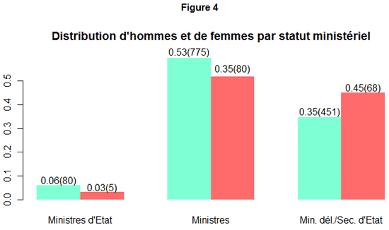 Si la tendance générale est univoque, les femmes sont toujours fortement sous-représentées lorsqu’on s’intéresse au statut ministériel (figure 4). Force est de constater que les femmes ministres sont plus souvent cantonnées dans les postes de « sous-ministres », c’est-à-dire ministres délégués et secrétaires d’État (45%) que leurs homologues masculins (34%) et que seules trois d’entre elles (pour 5 mandats), Simone Veil, Nicole Questiaux et Michèle Alliot-Marie, ont été nommées « ministres d’État ».