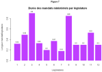 À l’inverse, la 7e législature a les durées les plus courtes, 18% en moyenne, suivie de la 5e avec 20%. Ces cas extrêmes permettent de voir que la durée moyenne en mandat ministériel n’est pas liée à la longueur de la législature étant donné que la 7e et la 11e ont duré toutes les deux 5 ans.
